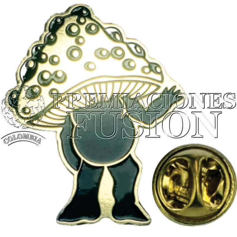 Pin personalizado metálico en bronce espesor 1 mm, grabado en alto y bajo relieve, esmalte negro horneado, dimensión 3×2,5 cm, reverso puntilla y broche presión